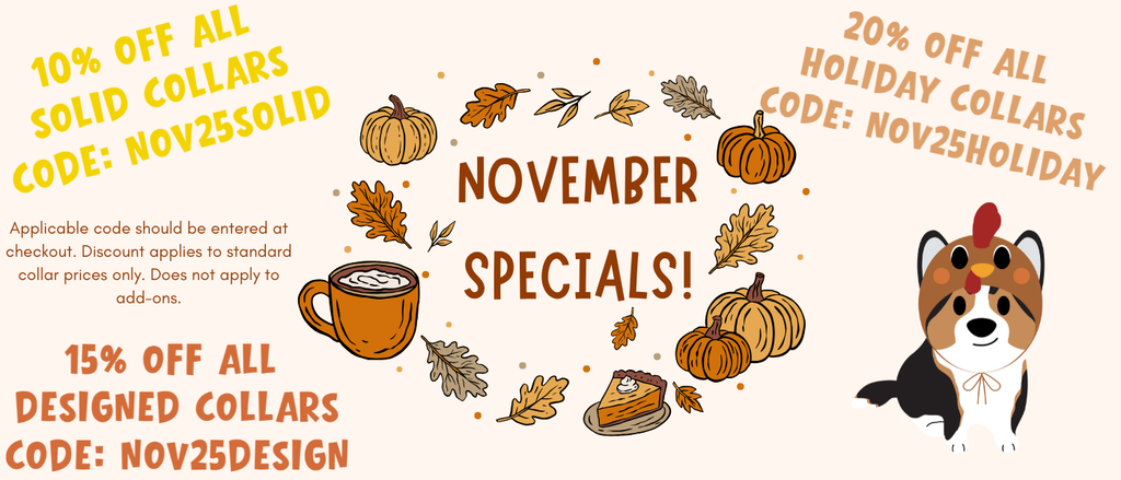 Buckle collars. Martingales. Harnesses. No-pull harnesses. Leashes. Hands free leashes. Bow ties. Prong collar covers. Personalization. Engraved Buckles. Breakaway collars.