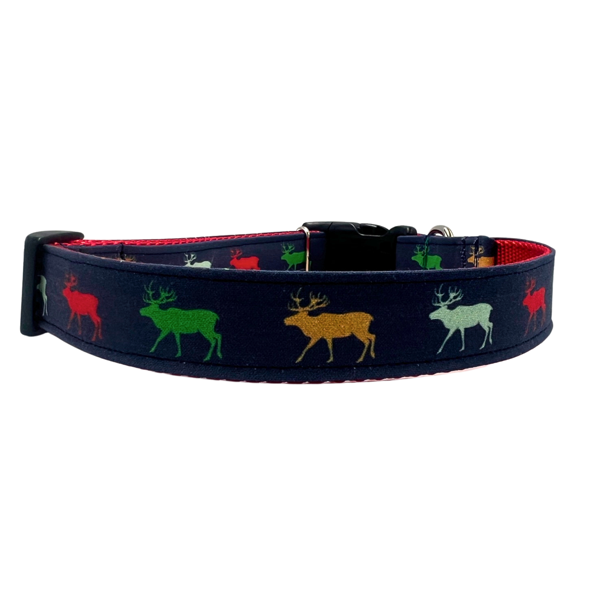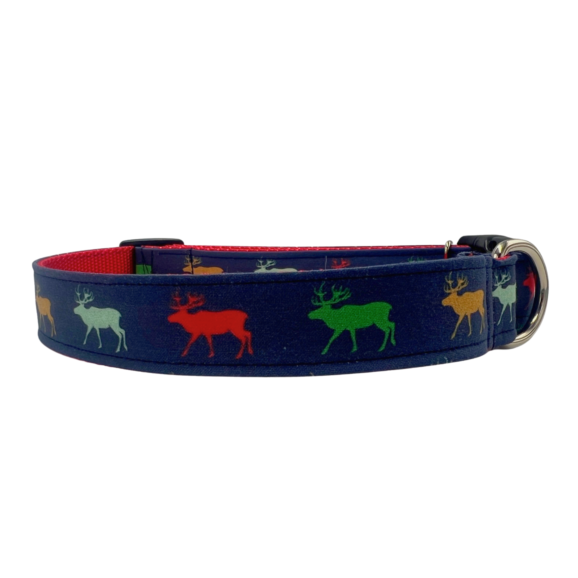 Sleek reindeers in red, green, beige, and gray on a navy background.