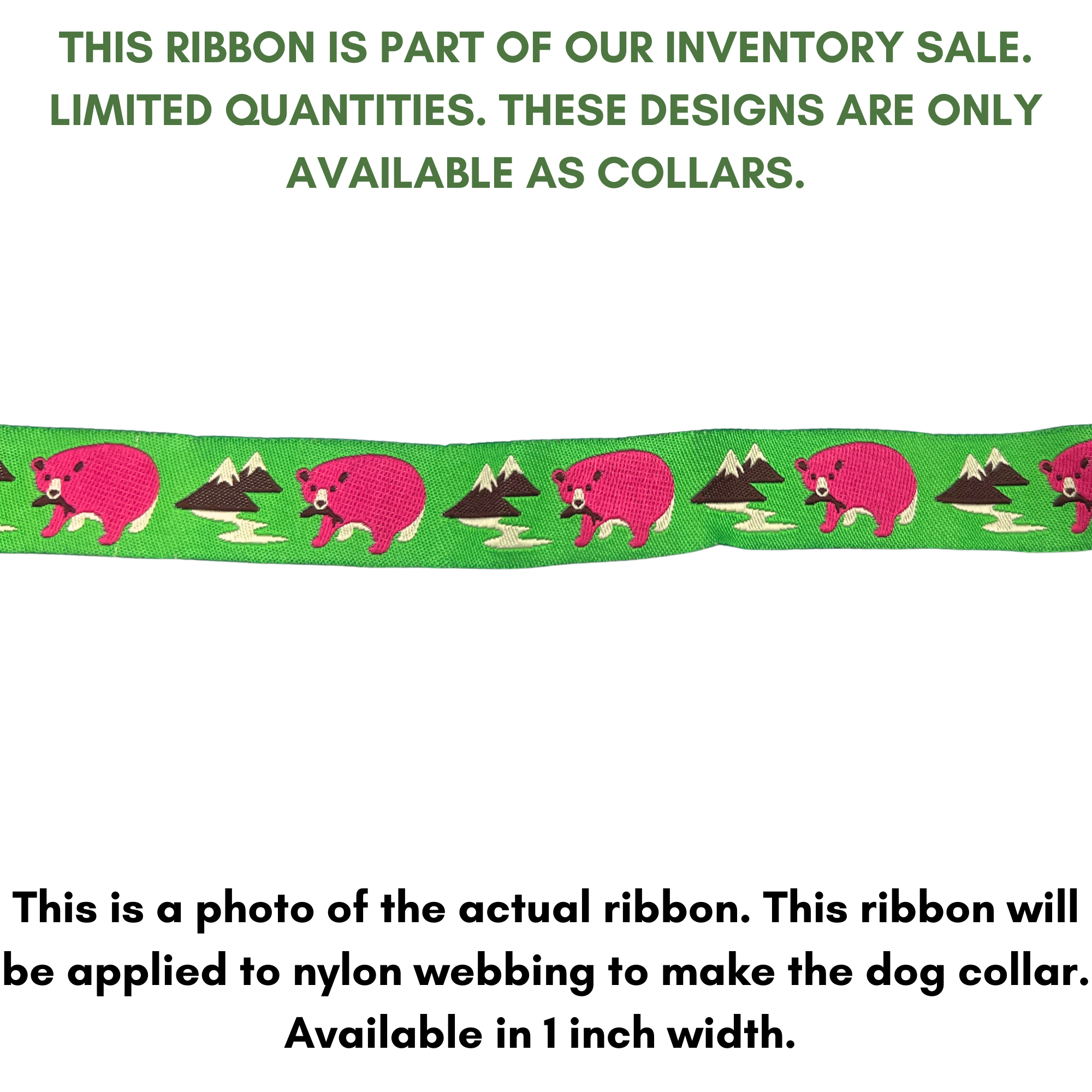 Hot Pink Bears and Mountains on Lime jacquard ribbon dog collar.