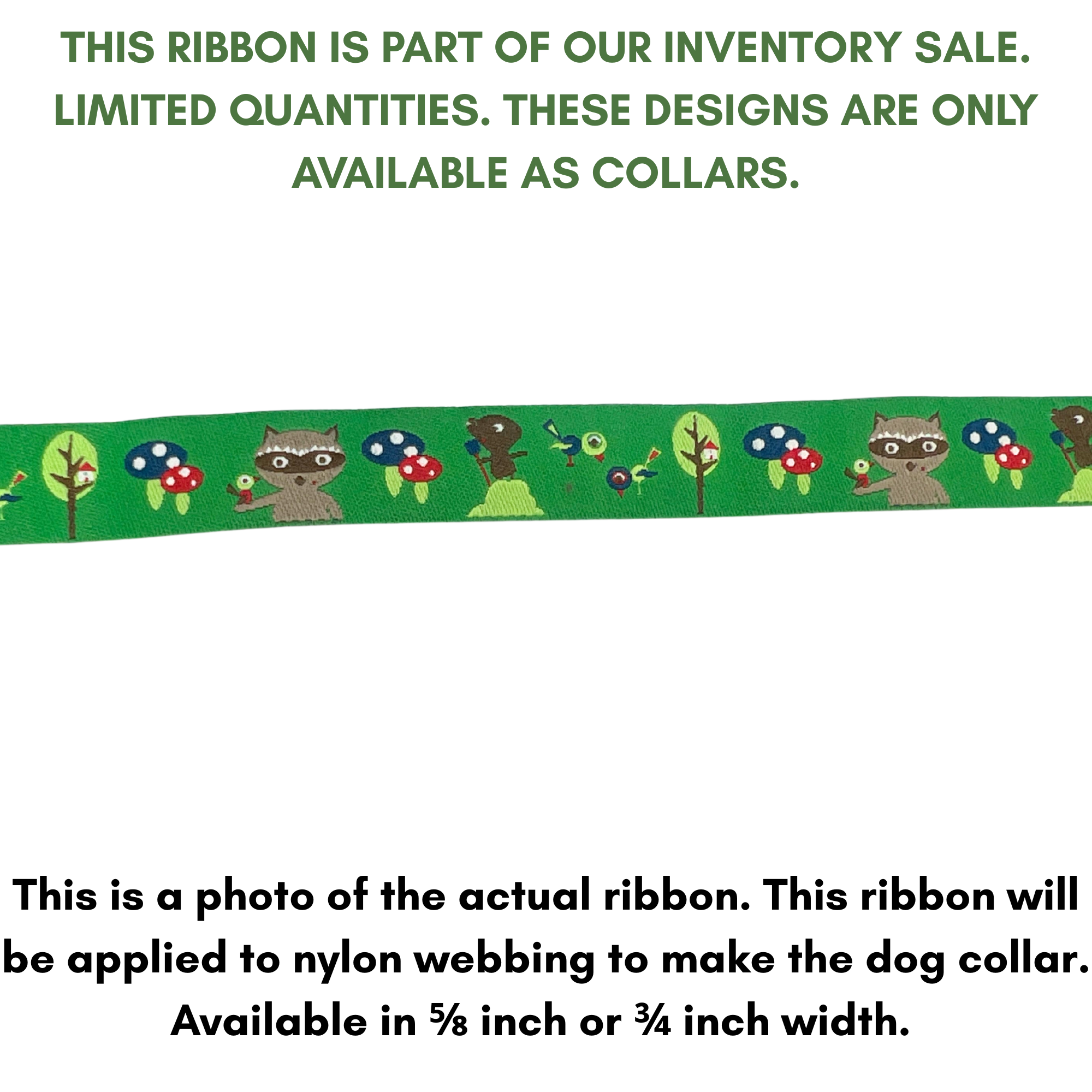 Raccoons and Mushrooms jacquard ribbon dog collar.