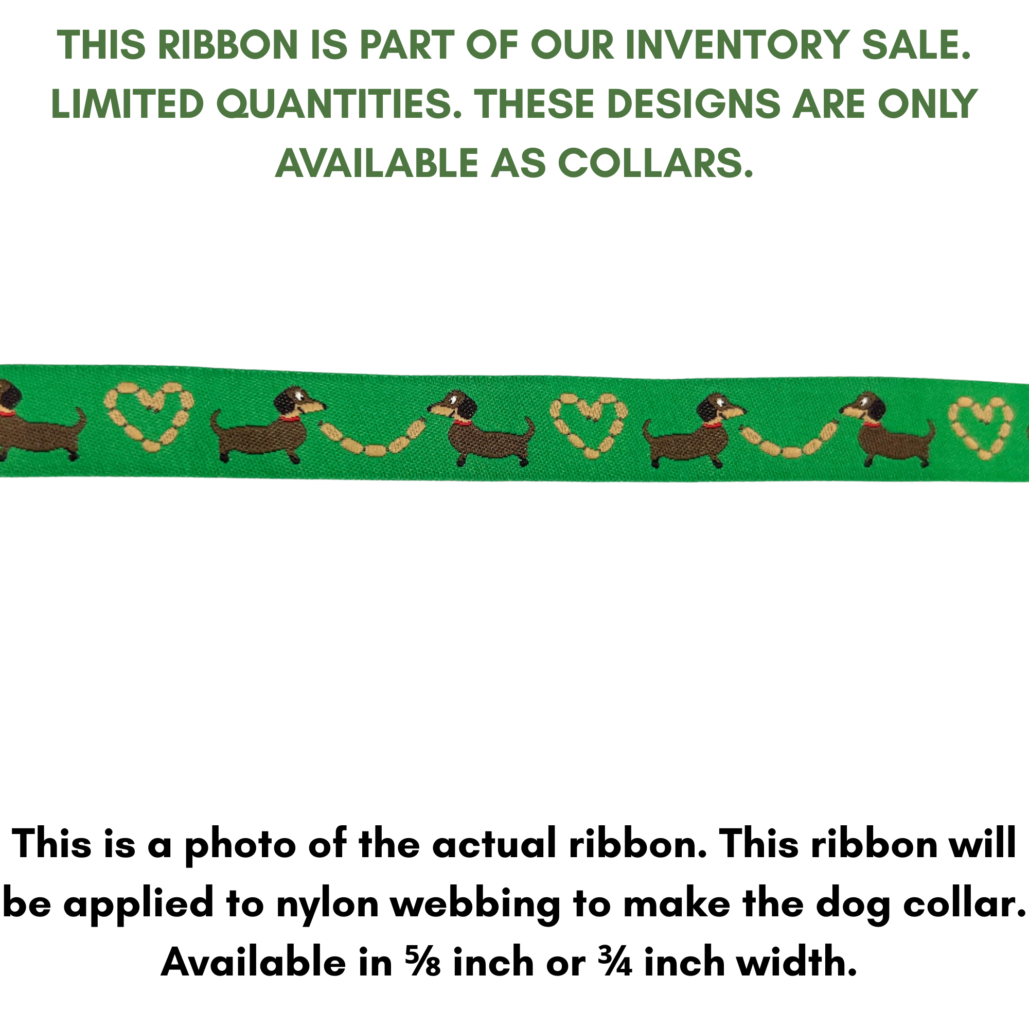 Little Wiener Dogs on Green jacquard ribbon dog collar.